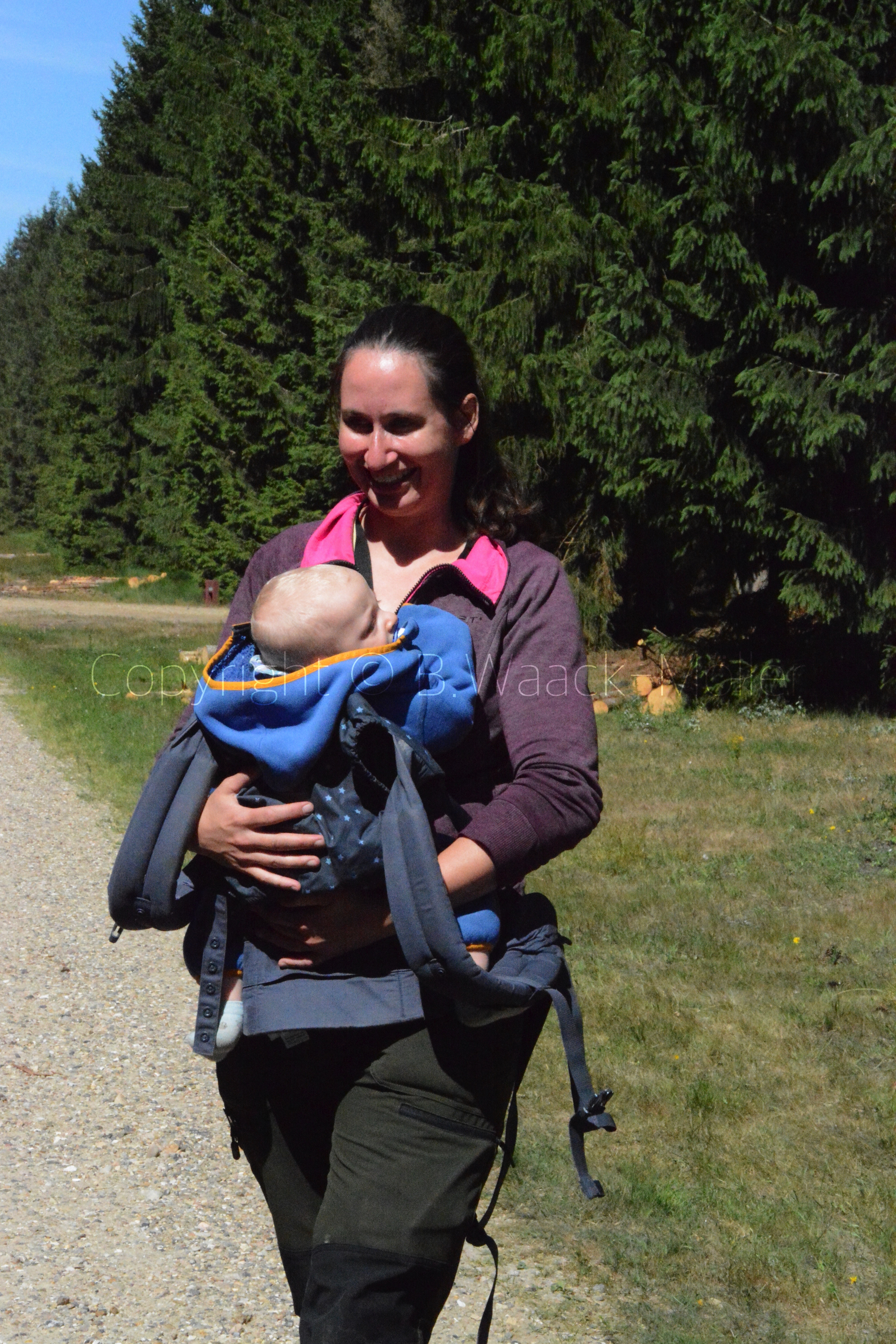 Nanna og Freja på veje mod vandkanten, imens Thomas og Frej venter tålmodigt